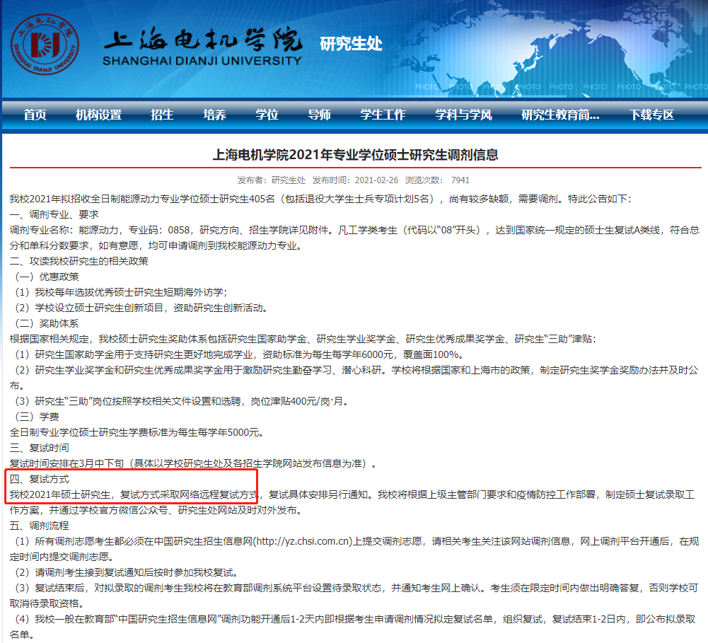 上海電機學院在調劑公告中也官宣復試方式采取網絡遠程復試方式,復試時間安排在3月中下旬。