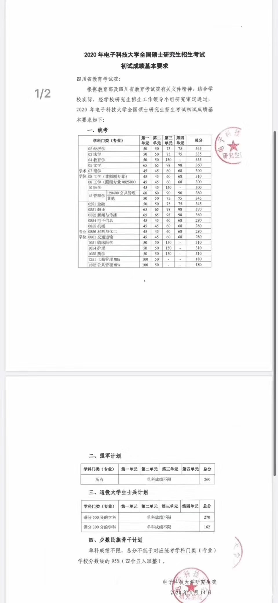 繼2020考研國家線公布后,34所自主劃線院校也陸續公布分數線,電子科技大學公布了2020年碩士研究生招生復試基本分數線,如下所示: