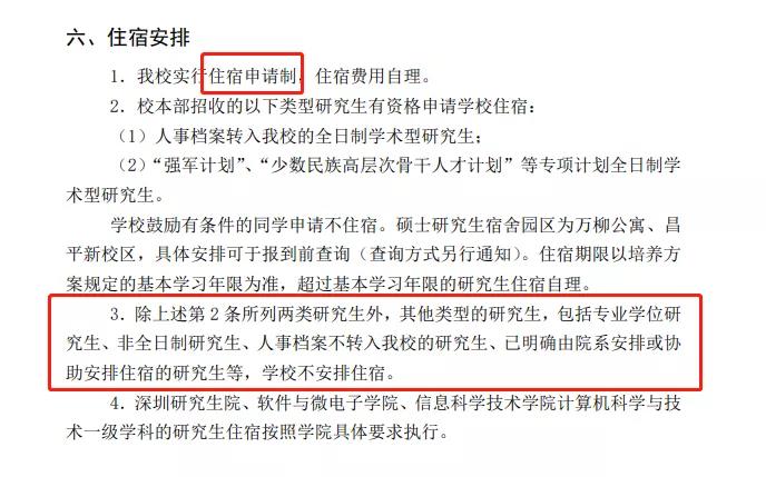 北京大學(xué)實(shí)行住宿申請制,專業(yè)學(xué)位研究生(專碩)、非全日制研究生、人事檔案不轉(zhuǎn)入北京大學(xué)的研究生、已明確由院系安排住宿的研究生等,北京大學(xué)不安排住宿。