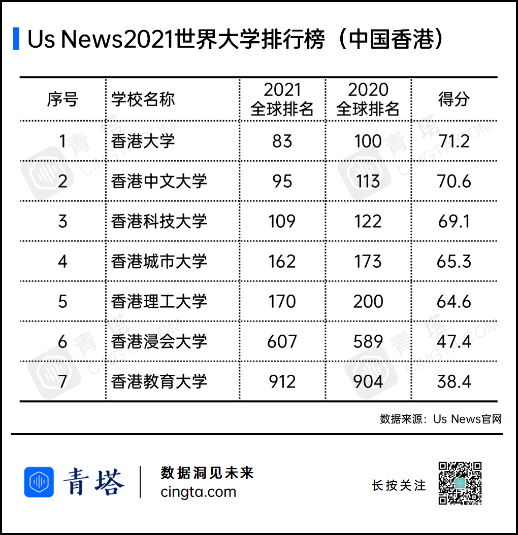 中國(guó)香港地區(qū)共有7所高校上榜,排名最高的是香港大學(xué),居全球83位。