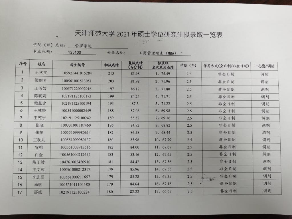 2021考研擬錄取名單:2021年天津師范大學非全日制工商管理碩士(MBA)擬錄取名單