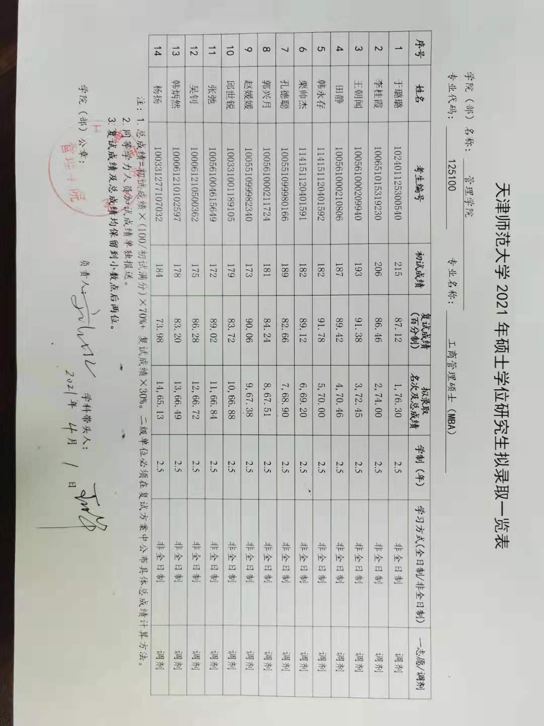 2021考研擬錄取名單:2021年天津師范大學非全日制工商管理碩士(MBA)擬錄取名單(第二批)