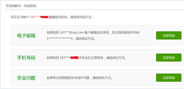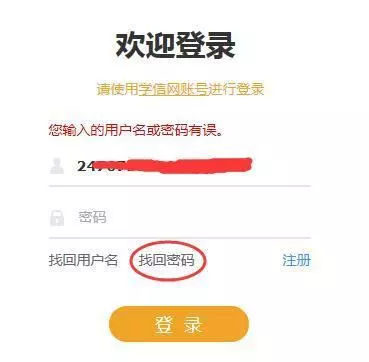 一、沒有學信網賬號 大學時涉及到學信檔案(含畢業證書圖像校對、學籍信息核對等),所以大多本科畢業生都會有學信網賬號;但如果您確實沒有,還是必須要注冊噠,畢竟這是研招網報唯一可使用的賬號。 注冊網址: https://account.chsi.com.cn/account/preregister.action 注冊時請注意以下兩點: ① 注冊學信網賬號必須實名本人身份證號; ② 用自己的手機號和郵箱注冊,并完成郵箱綁定,以免日后忘記密碼時,原本手機號已停用或者忘記密保問題無法找回。 二、學信網賬號異常 有學信網賬號,但忘記密碼: 1、找回密碼 登錄時使用手機號/身份證號/郵箱,輸入密碼之后,提示:您輸入的用戶名或密碼有誤。