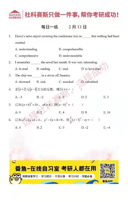 以上就是社科賽斯考研網小編為大家整理2022考研每日一練:2月13日每日一練及答案的全部內容,希望各位考生堅持利用起來,更多每日一練內容請持續關注社科賽斯考研網