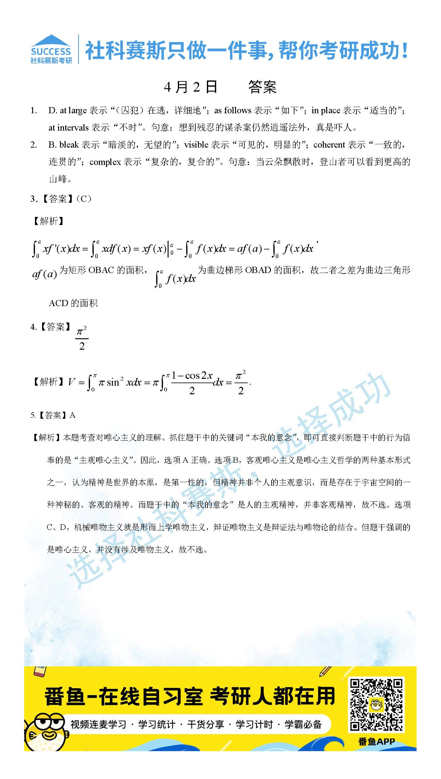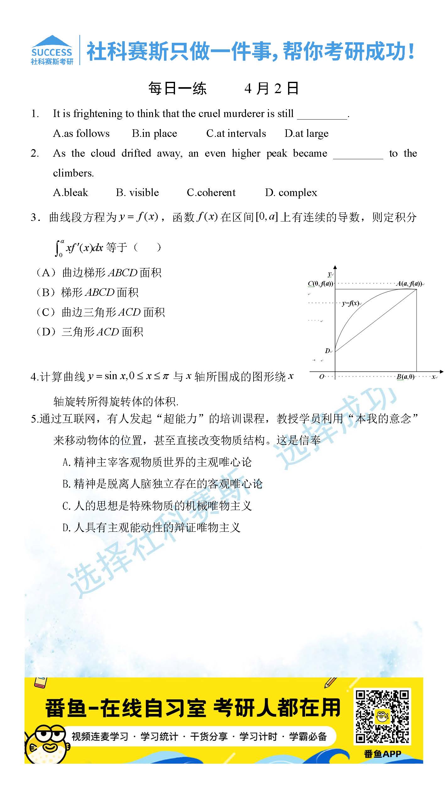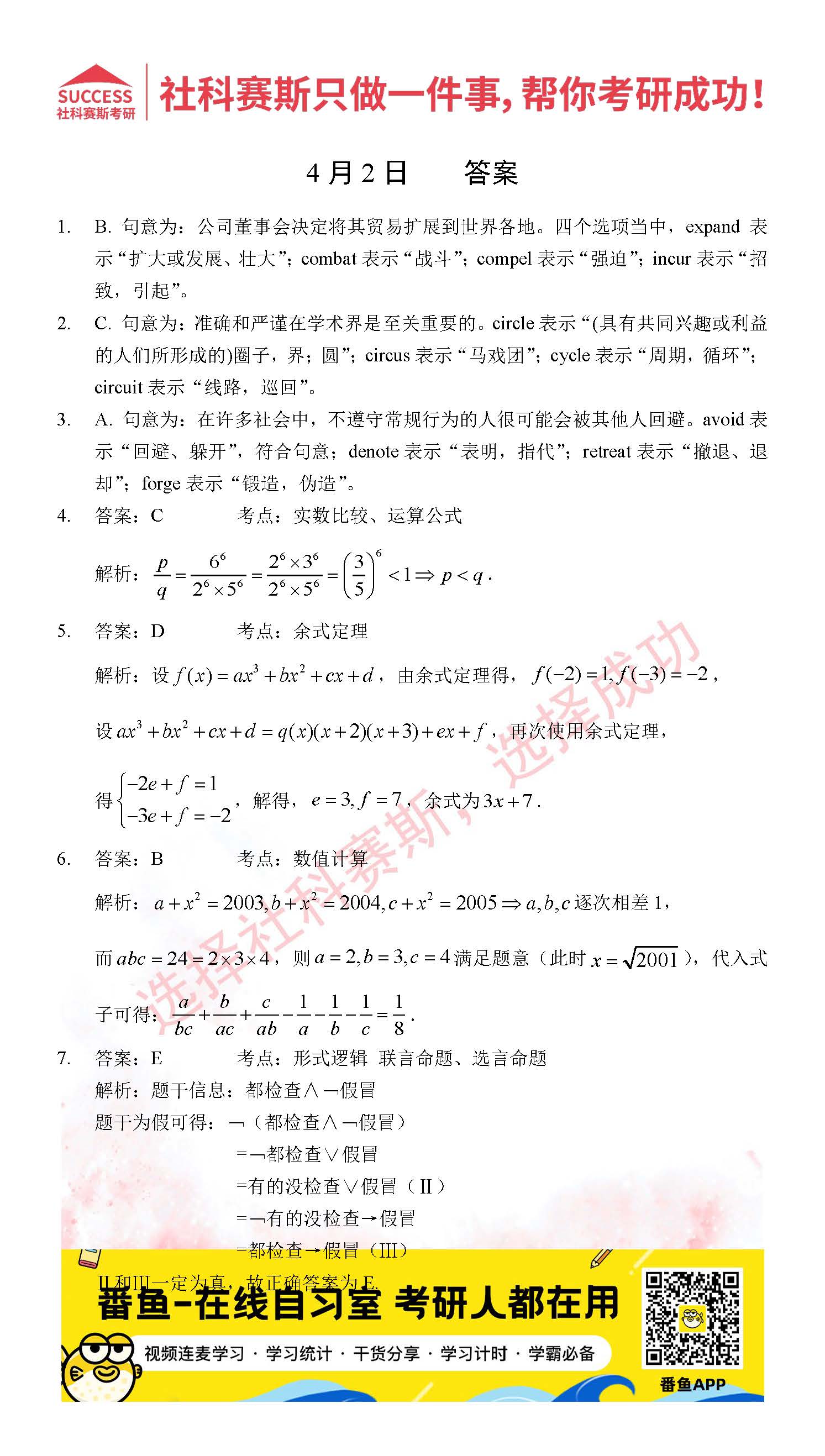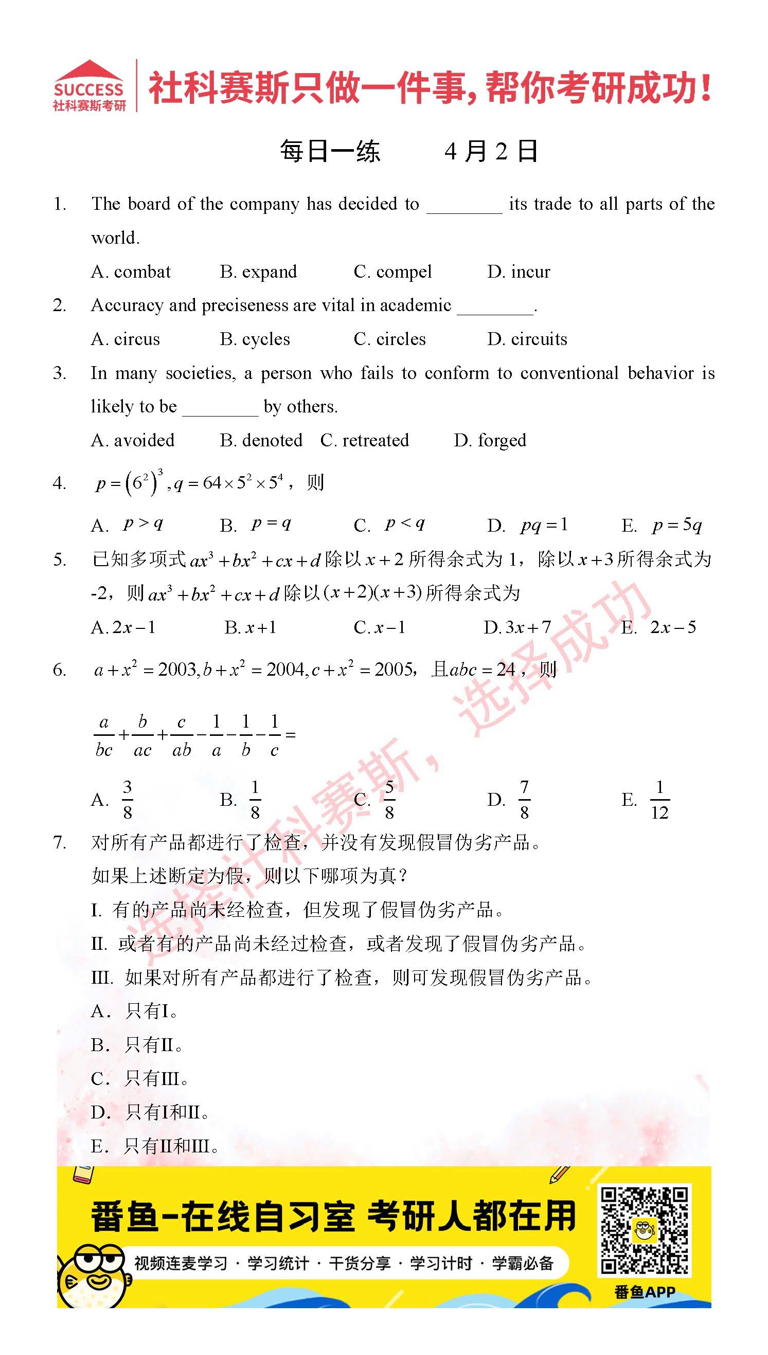 ?以上就是社科賽斯考研網(wǎng)小編為大家整理2022考研每日一練:4月2日管理類聯(lián)考每日一練及答案的全部內容,希望各位考生堅持利用起來,更多每日一練內容請持續(xù)關注社科賽斯考研網(wǎng)