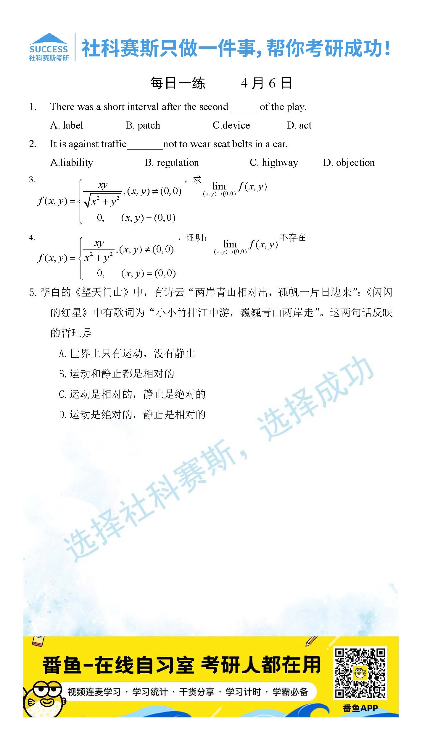 ?以上就是社科賽斯考研網小編為大家整理2022考研每日一練:4月6日管理類聯考每日一練及答案的全部內容,希望各位考生堅持利用起來,更多每日一練內容請持續關注社科賽斯考研網