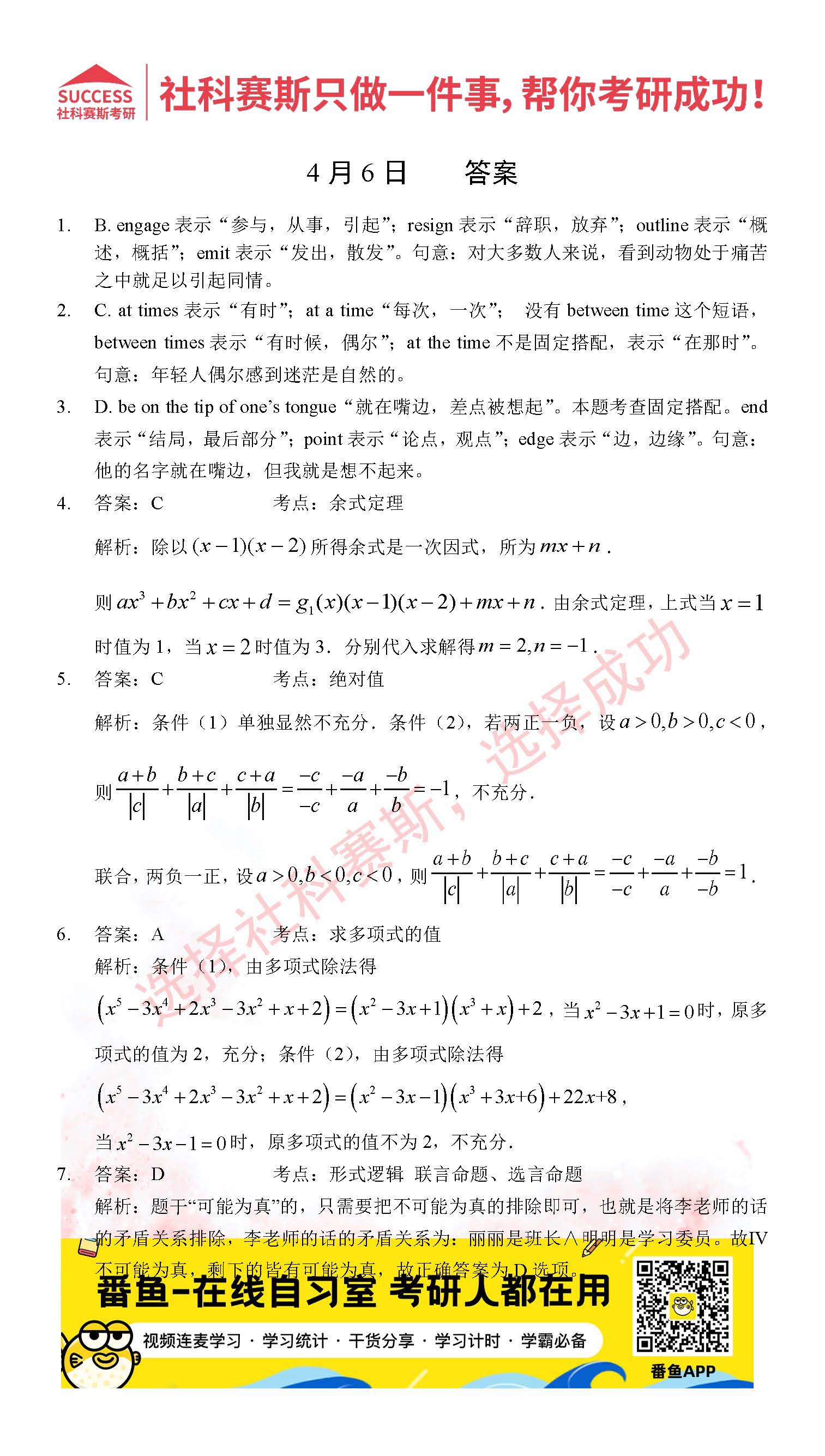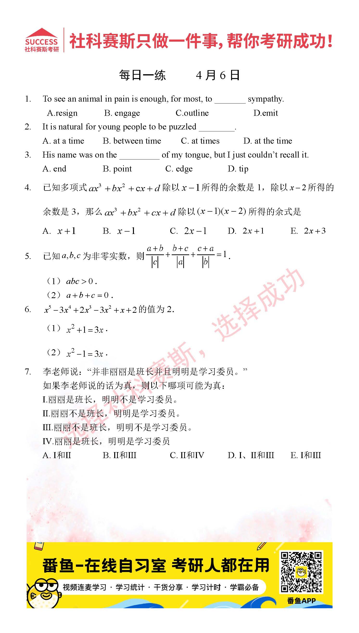 2022考研每日一練:4月6日管理類聯考每日一練及答案