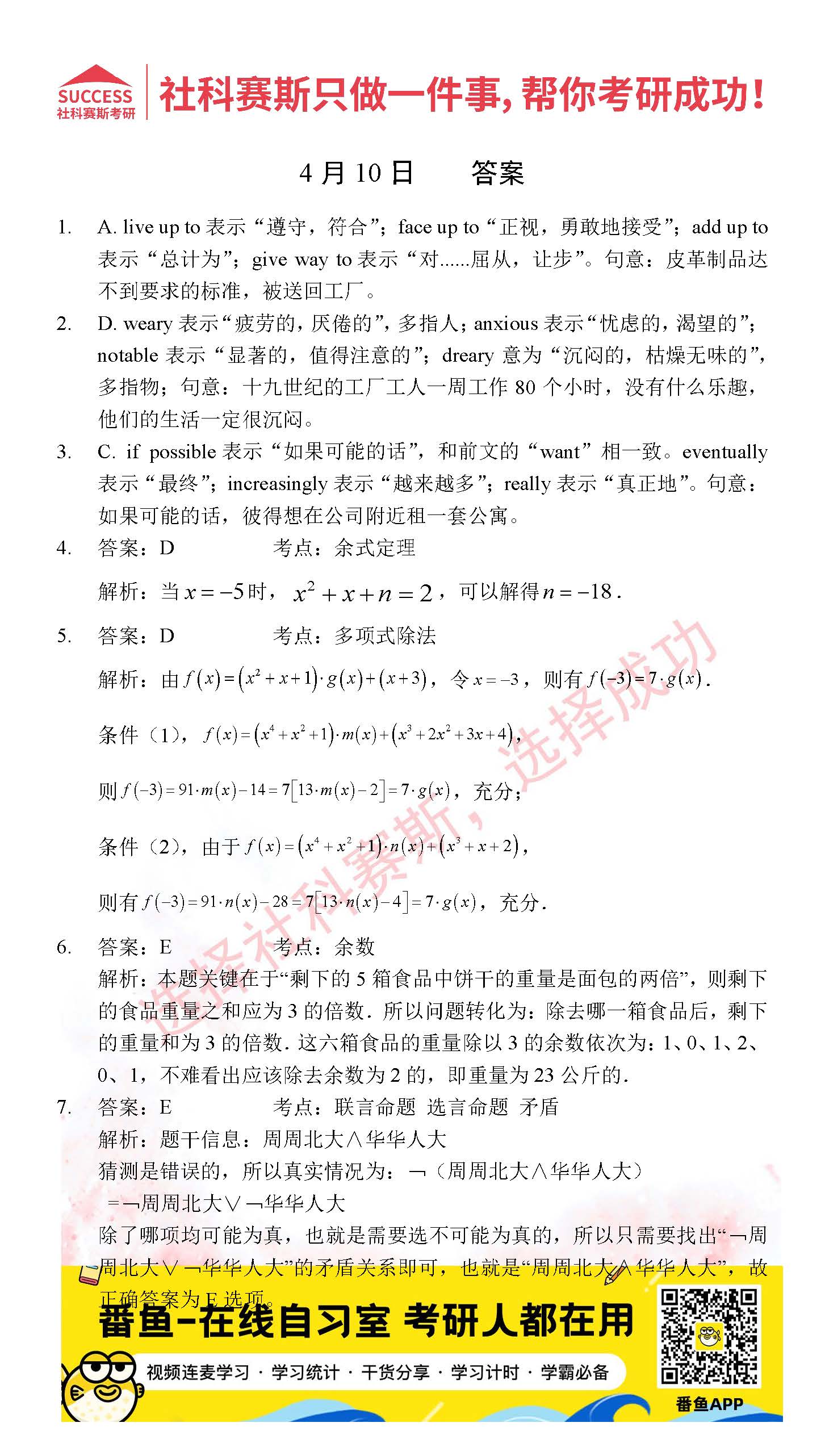 ?以上就是社科賽斯考研網(wǎng)小編為大家整理2022考研每日一練:4月10日管理類聯(lián)考每日一練及答案的全部內(nèi)容,希望各位考生堅持利用起來,更多每日一練內(nèi)容請持續(xù)關(guān)注社科賽斯考研網(wǎng)