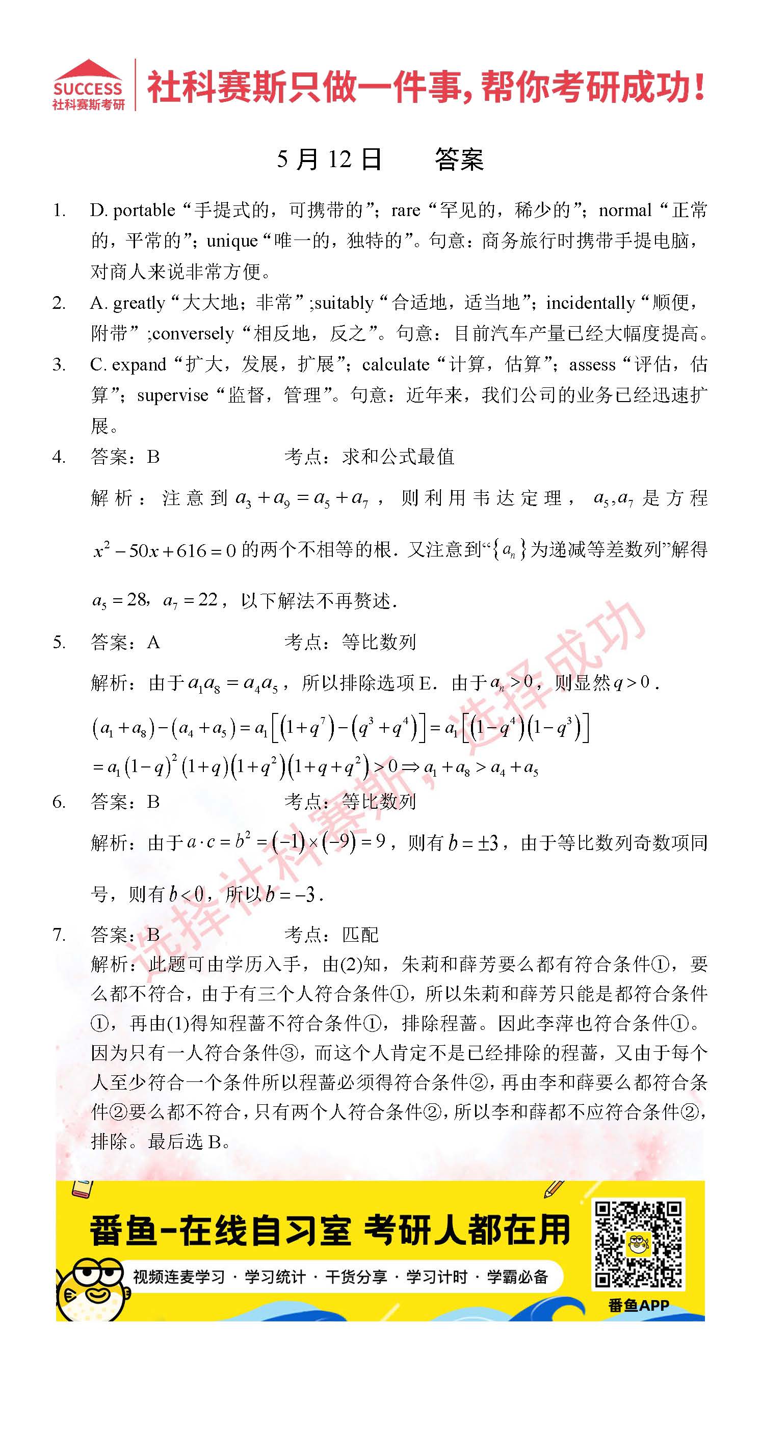 以上就是社科賽斯考研網小編為大家整理2022考研每日一練:5月12日管理類聯考每日一練及答案的全部內容,希望各位考生堅持利用起來,更多每日一練內容請持續關注社科賽斯考研網