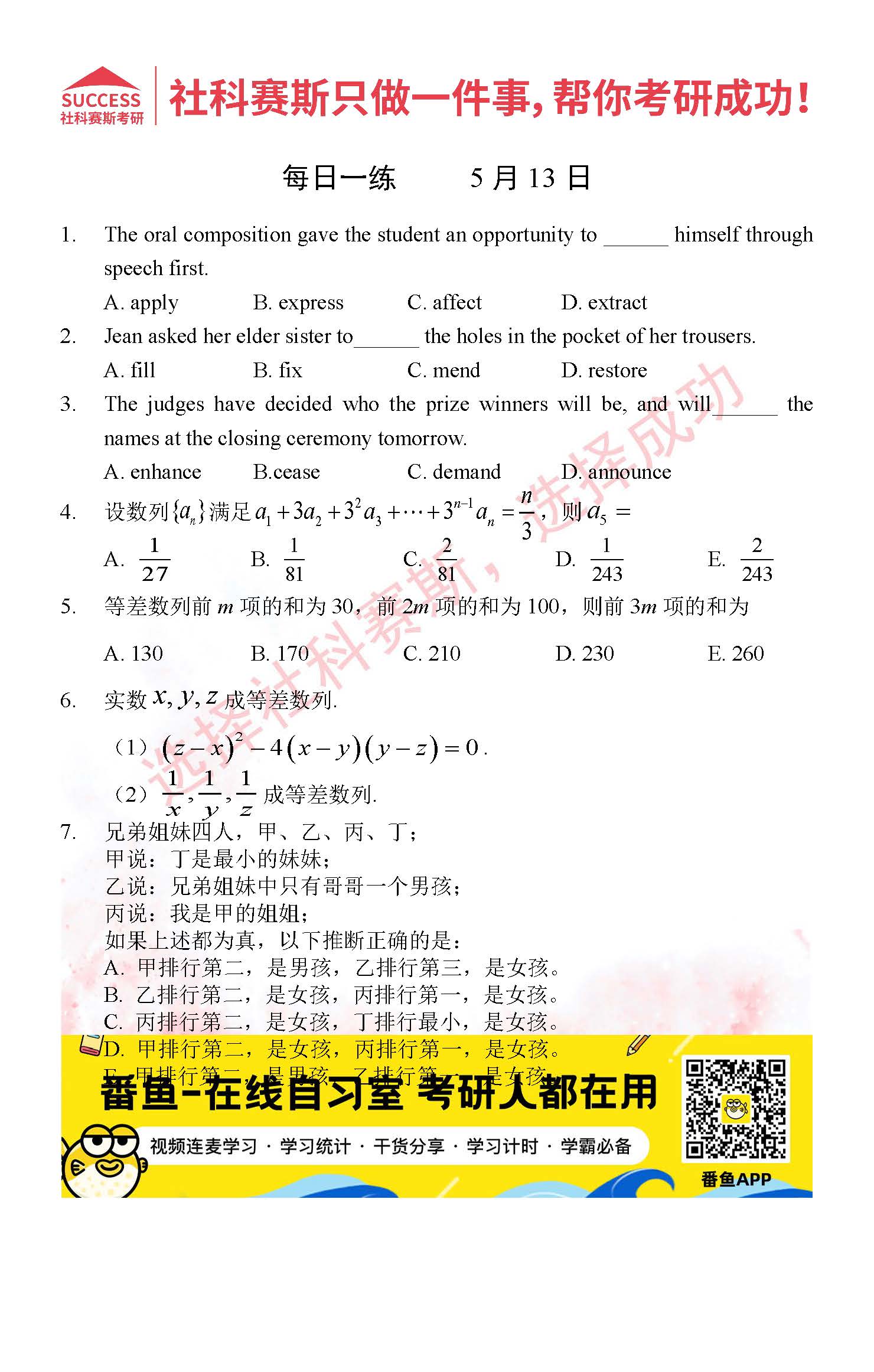 2022考研每日一練:5月13日管理類聯考每日一練及答案
