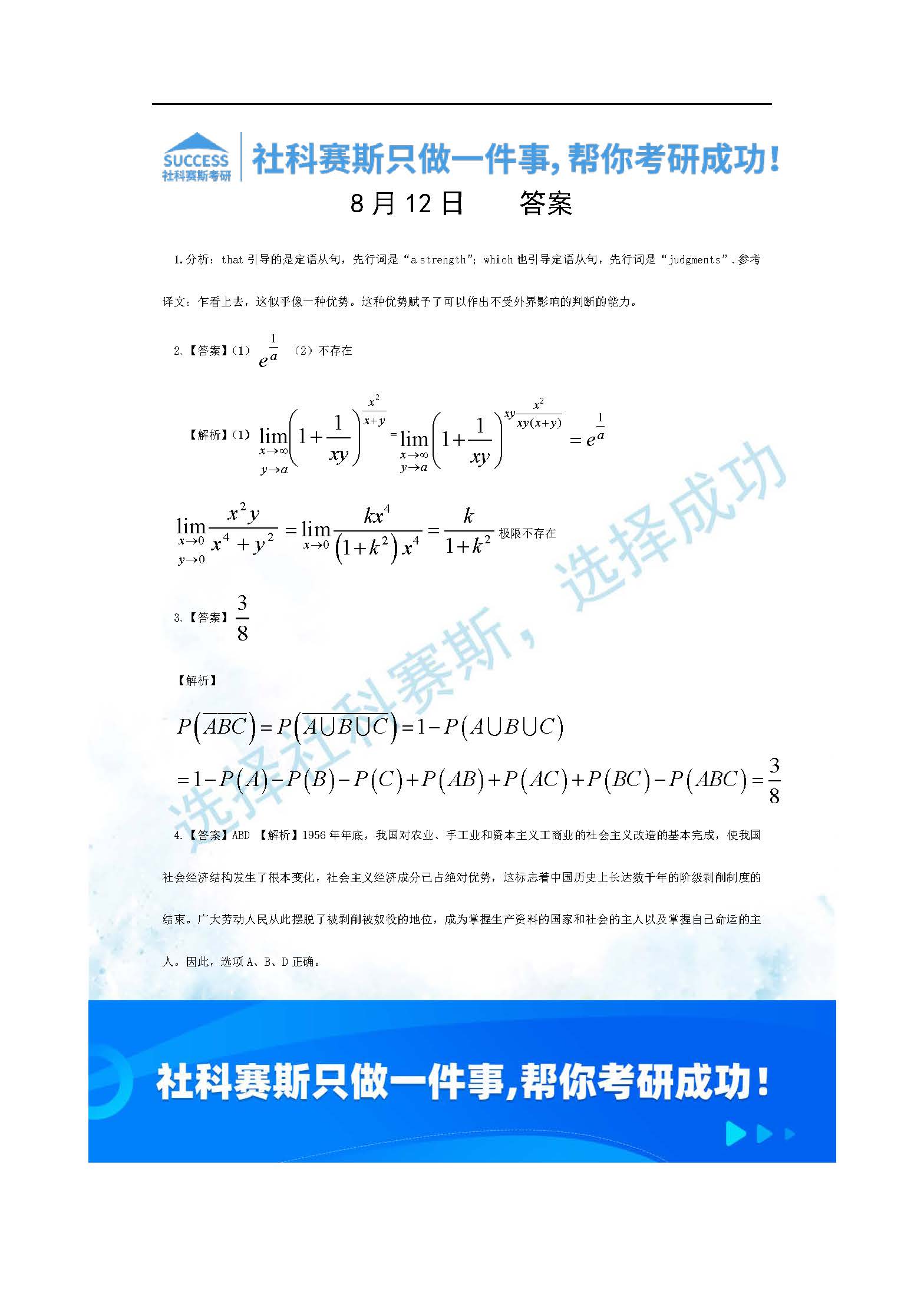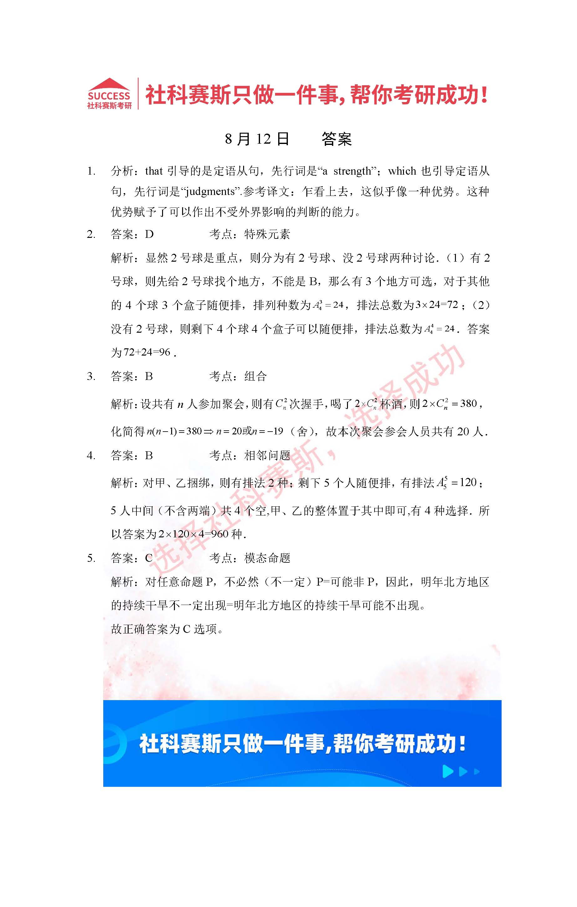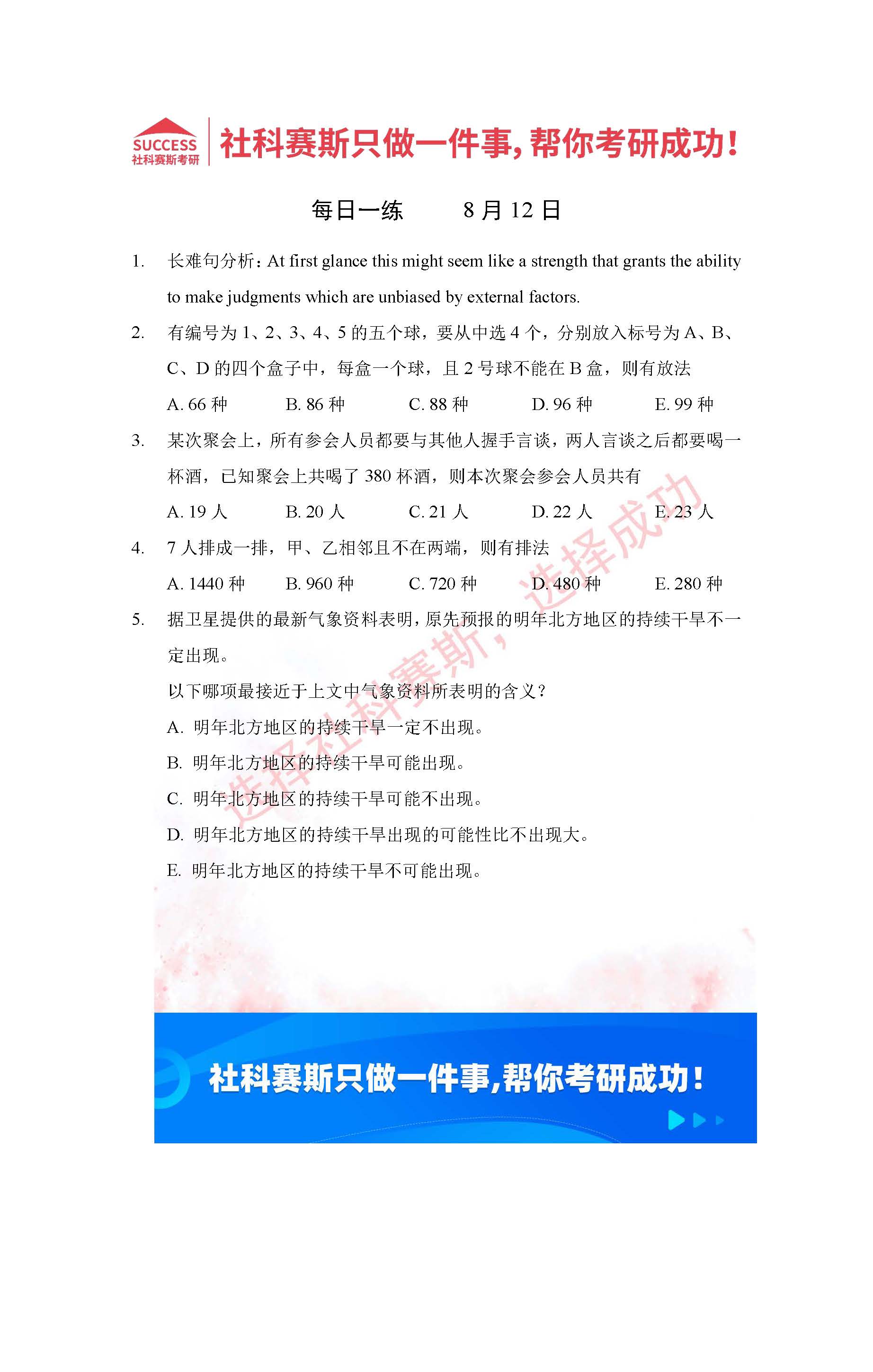 以上就是社科賽斯考研網(wǎng)小編為大家整理2022考研每日一練:8月12日管理類聯(lián)考每日一練及答案的全部?jī)?nèi)容,希望各位考生堅(jiān)持利用起來(lái),更多每日一練內(nèi)容請(qǐng)持續(xù)關(guān)注社科賽斯考研網(wǎng)