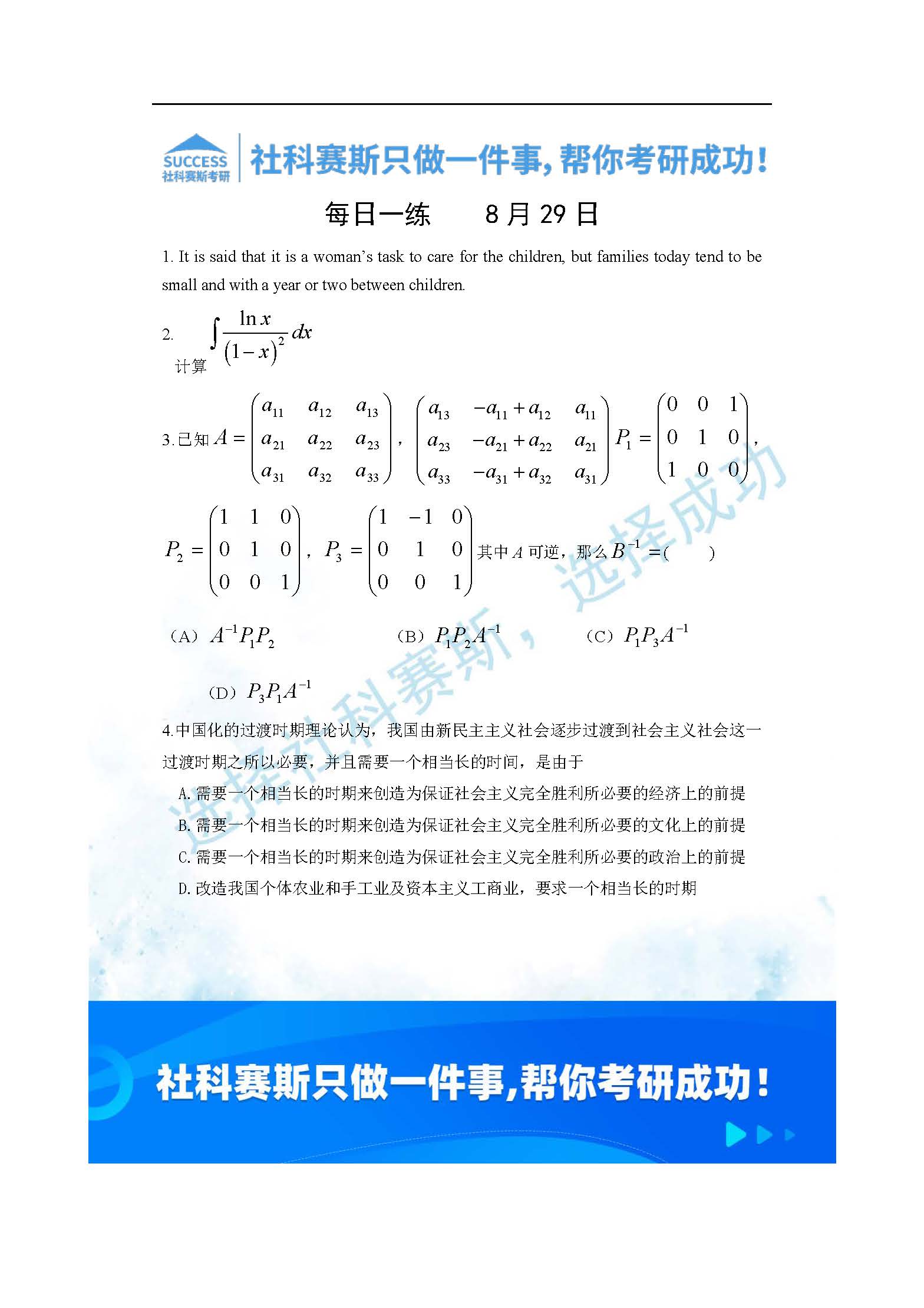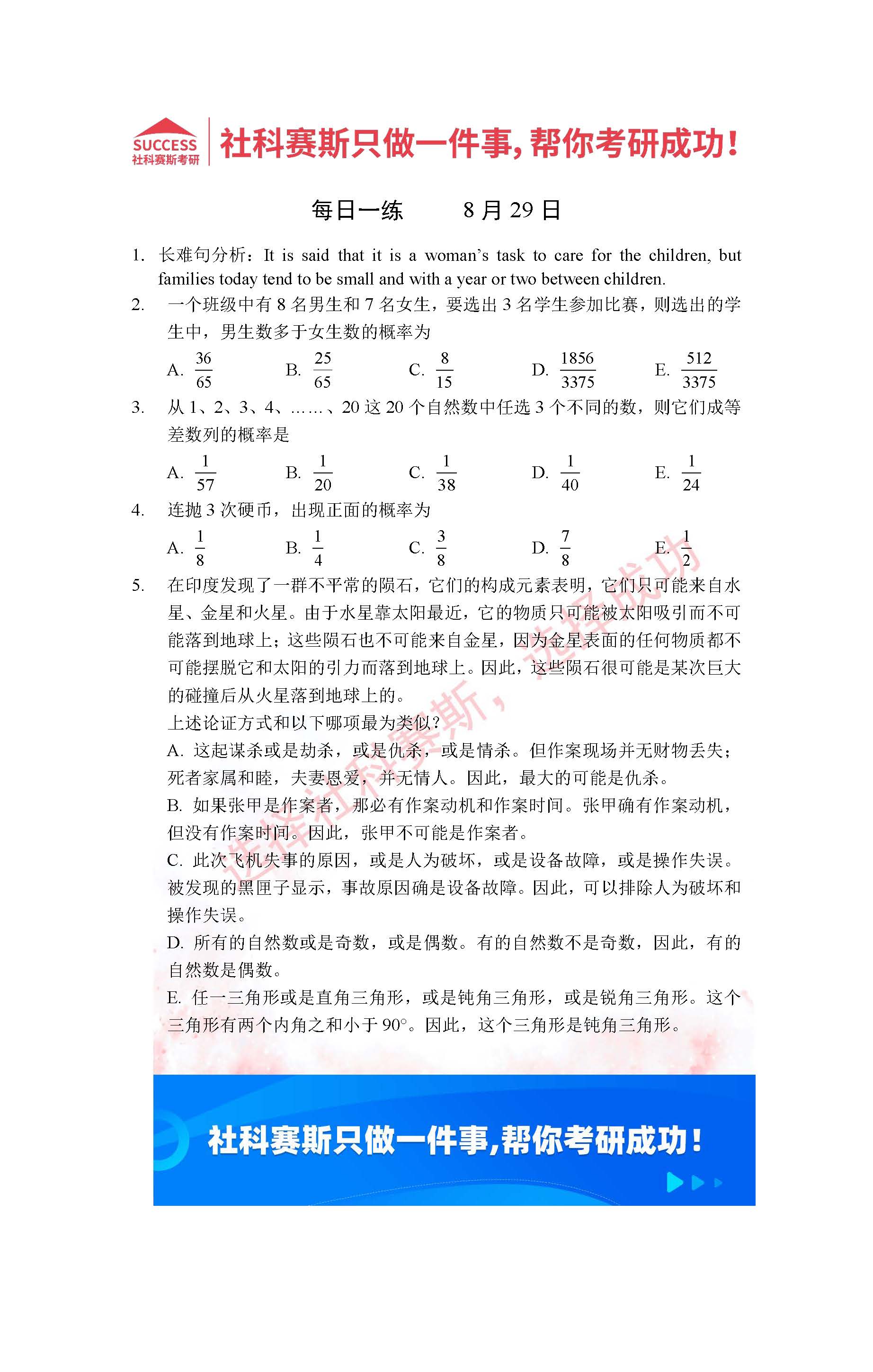 以上就是社科賽斯考研網小編為大家整理2022考研每日一練:8月29日管理類聯考每日一練及答案的全部內容,希望各位考生堅持利用起來,更多每日一練內容請持續關注社科賽斯考研網