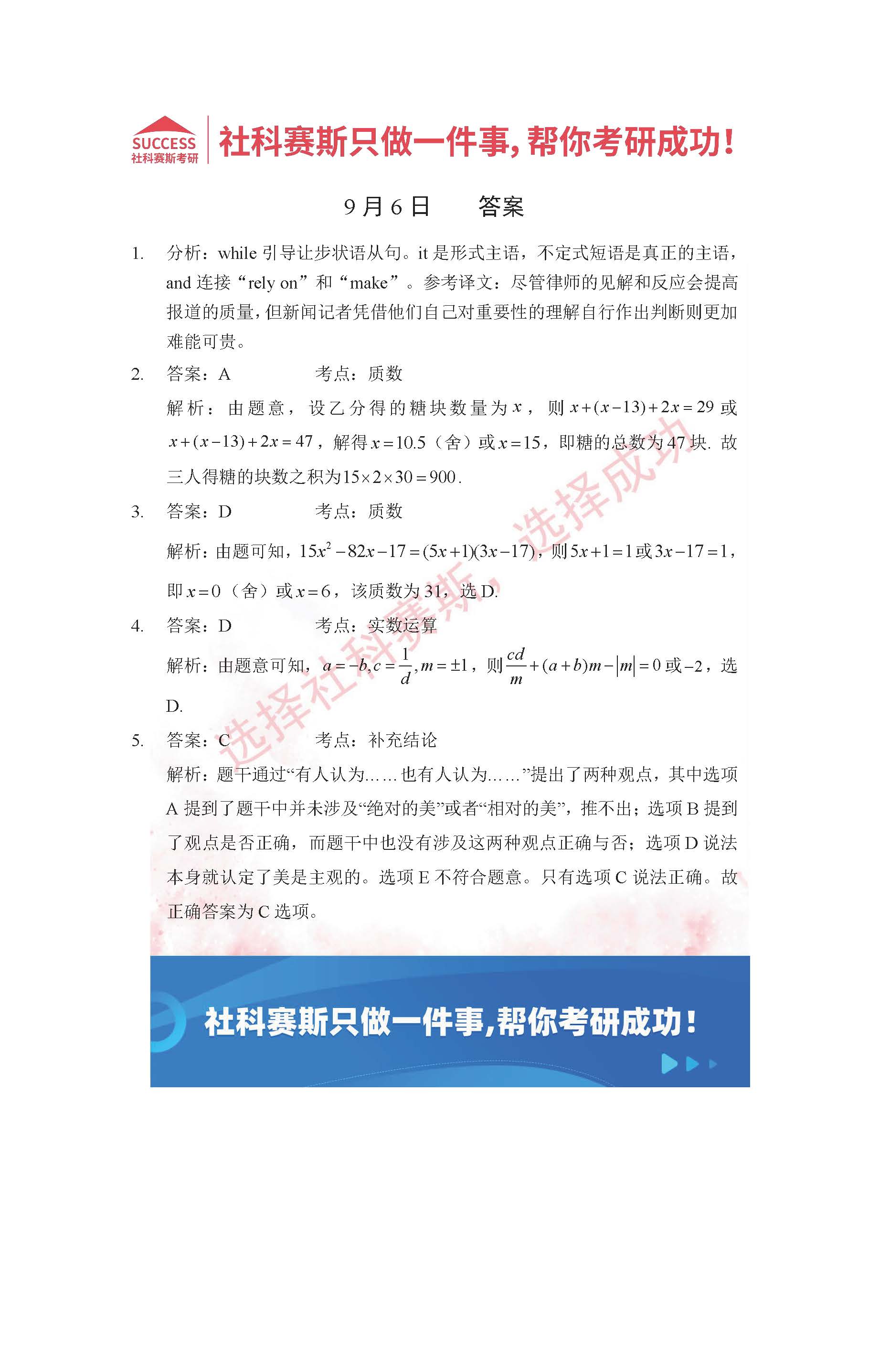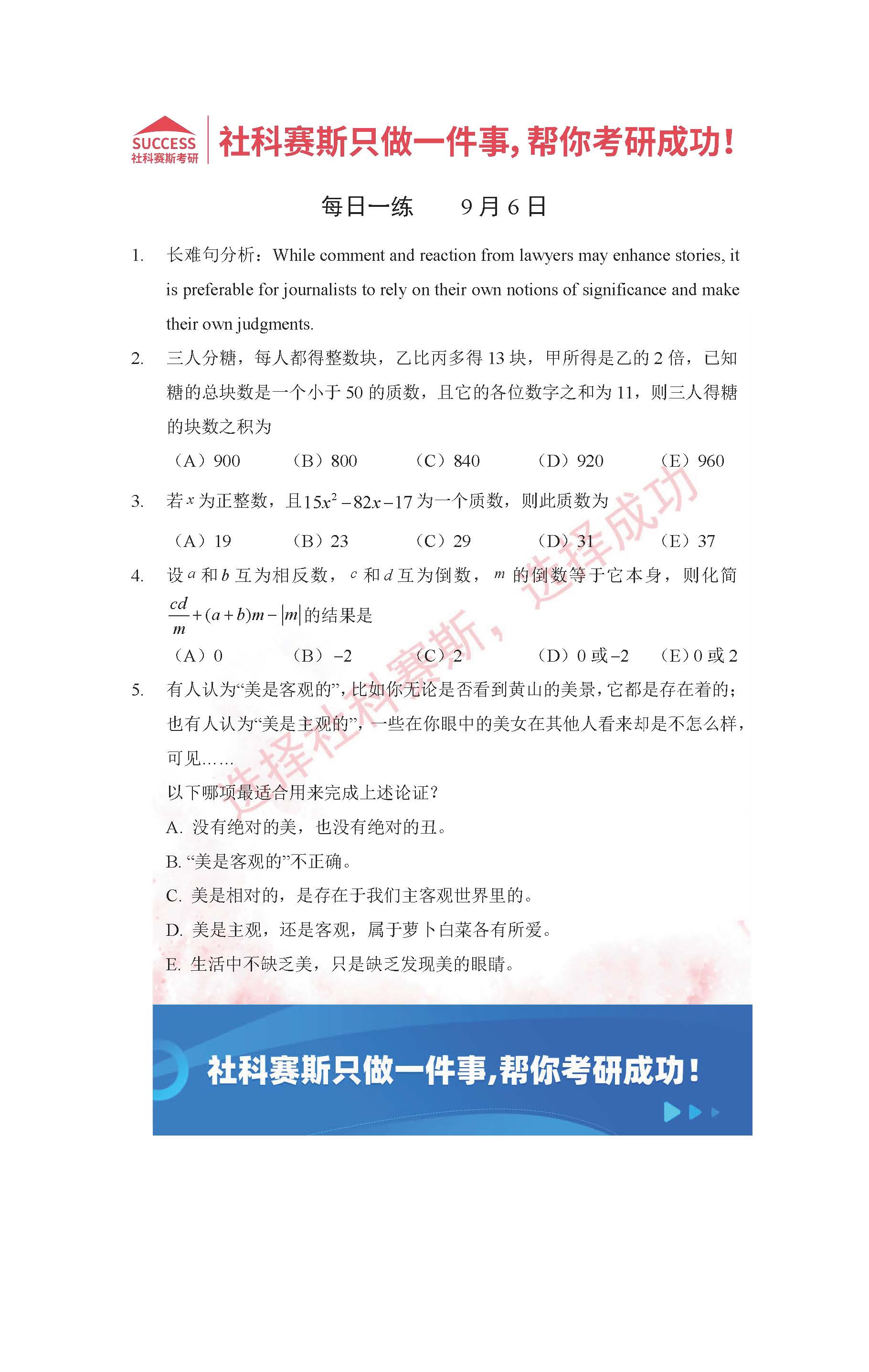 以上就是社科賽斯考研網小編為大家整理2022考研每日一練:9月6日管理類聯考每日一練及答案的全部內容,希望各位考生堅持利用起來,更多每日一練內容請持續關注社科賽斯考研網