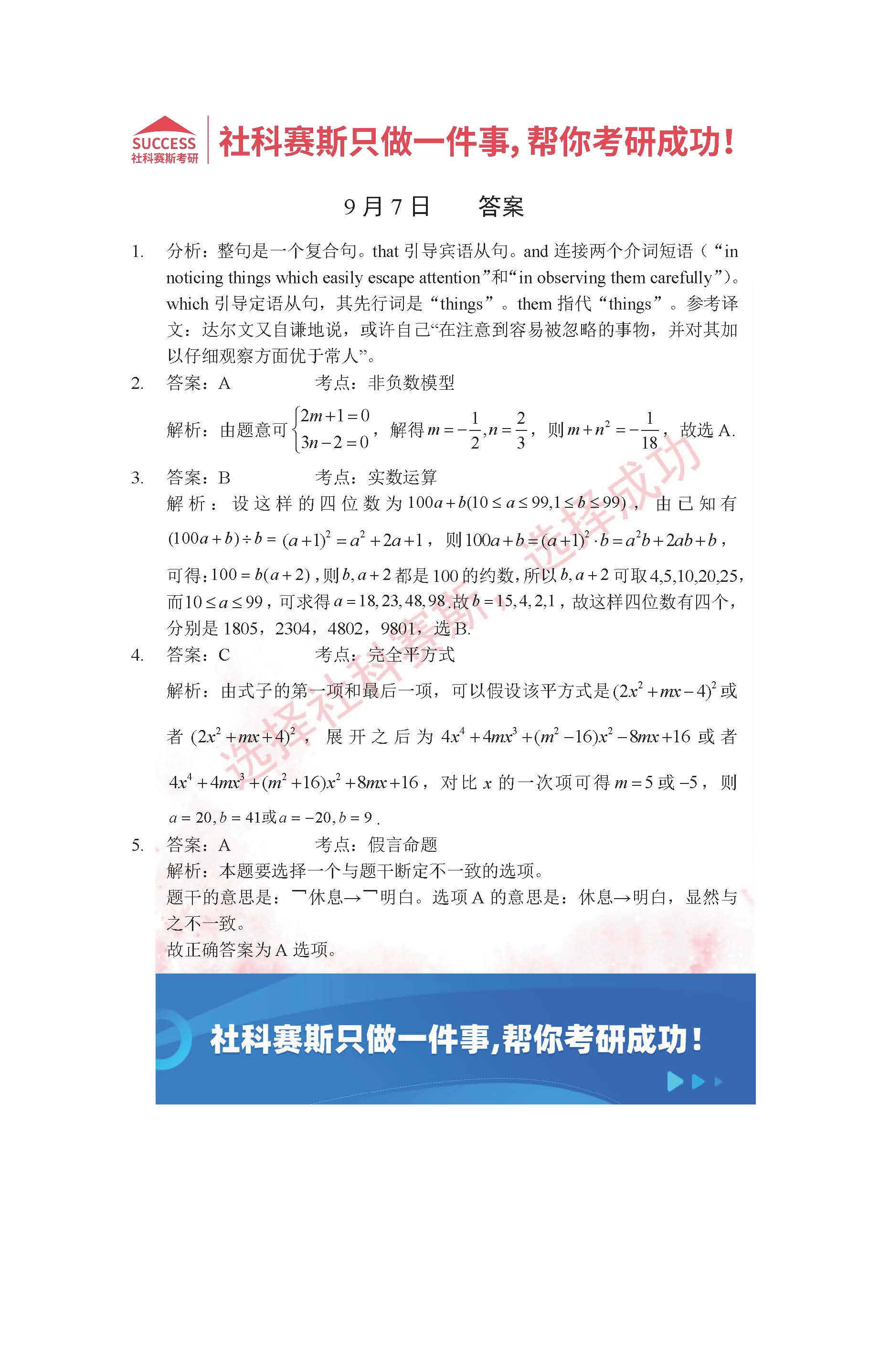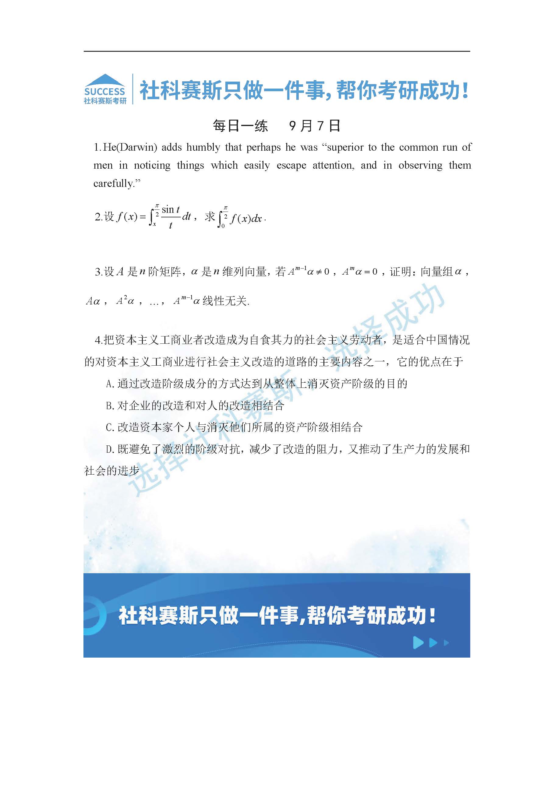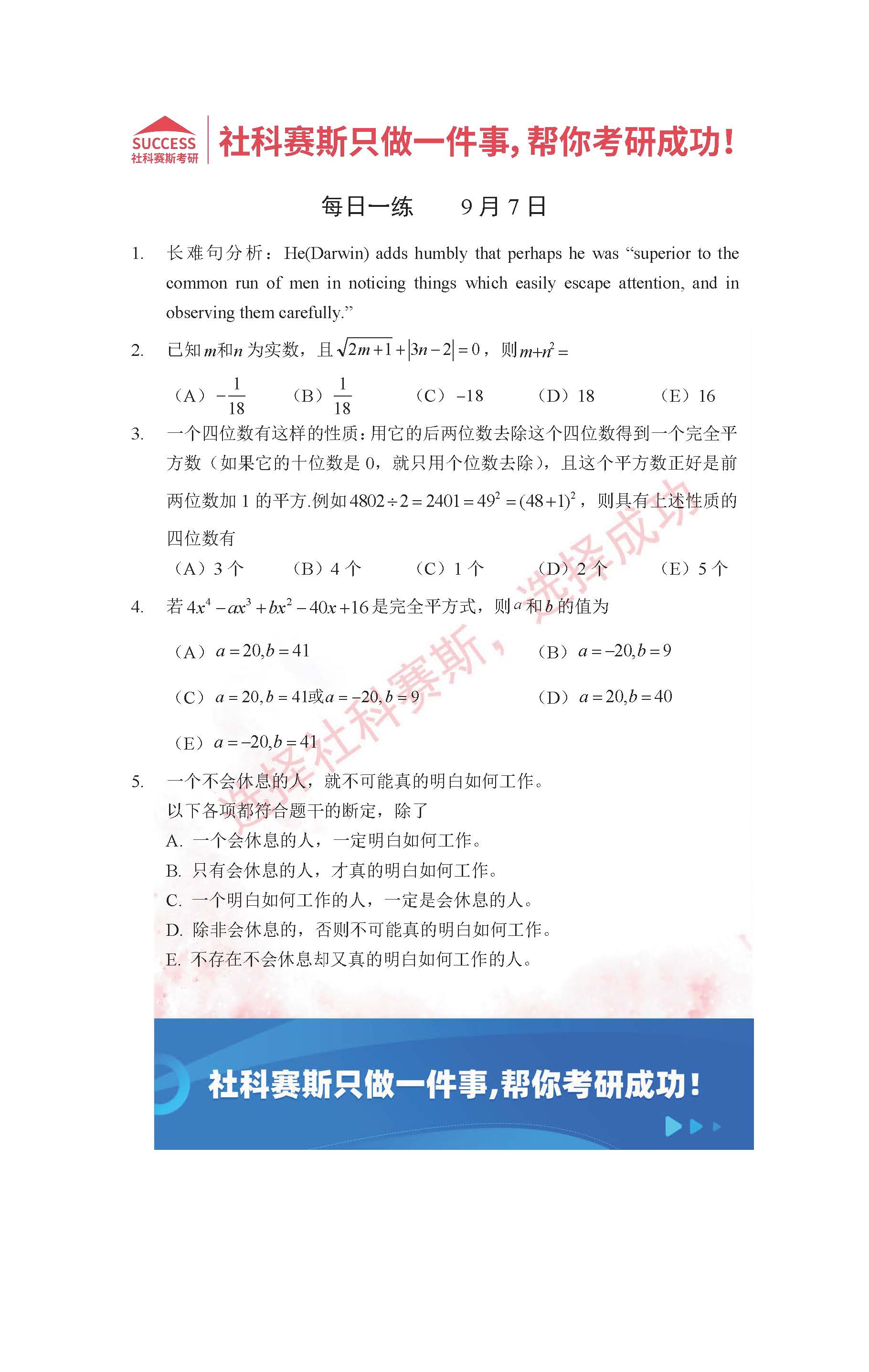 以上就是社科賽斯考研網小編為大家整理2022考研每日一練:9月7日管理類聯考每日一練及答案的全部內容,希望各位考生堅持利用起來,更多每日一練內容請持續關注社科賽斯考研網