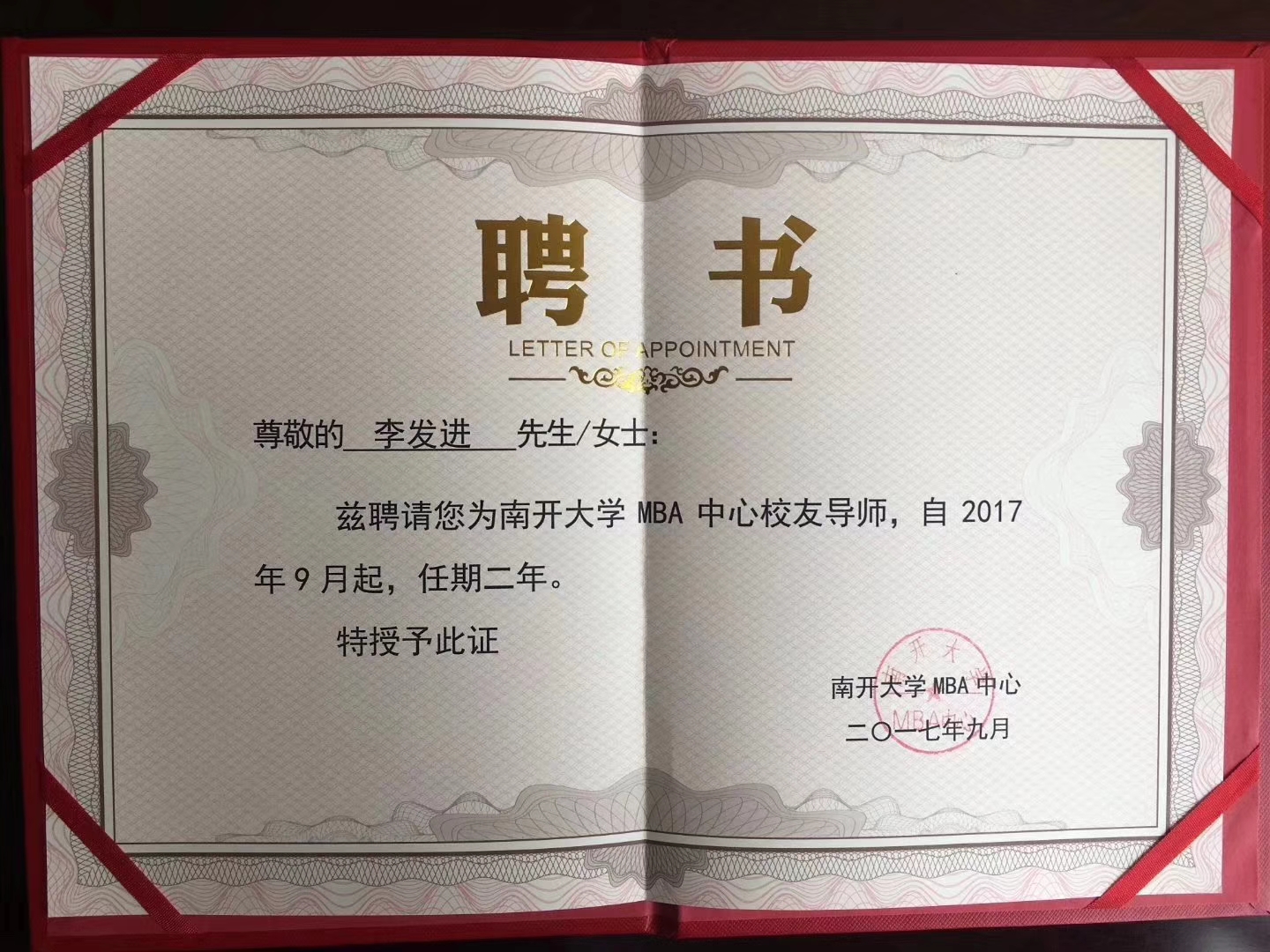 2017年李發(fā)進校長被南開大學(xué)聘為校友導(dǎo)師