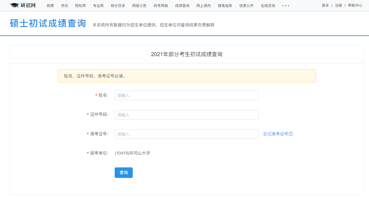 井岡山大學考研初試成績查詢入口:https://yz.chsi.com.cn/apply/cjcx/t/10419.dhtml