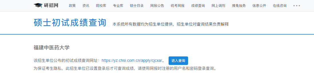 福建中醫藥大學考研初試成績查詢入口:https://yz.chsi.com.cn/apply/cjcx/sch/10393.dhtml