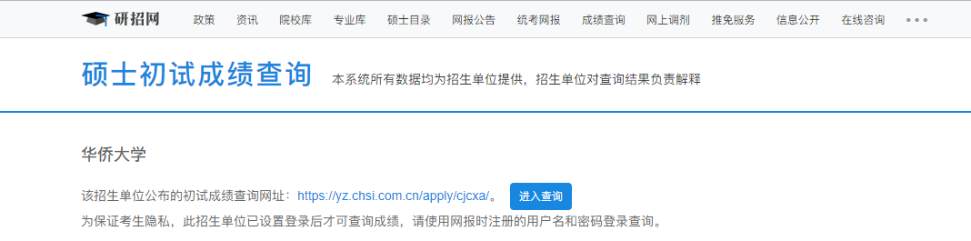 華僑大學考研初試成績查詢入口:https://yz.chsi.com.cn/apply/cjcx/sch/10385.dhtml