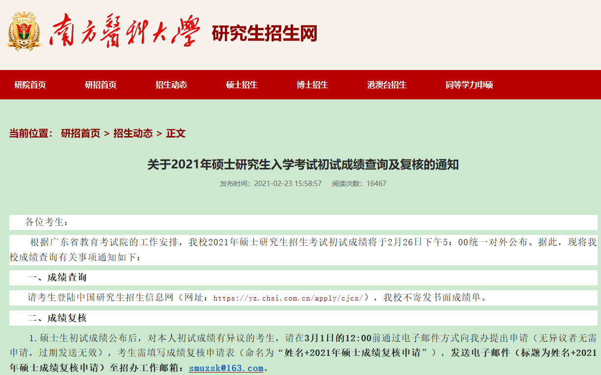 2021考研初試成績:南方醫科大學考研初試成績查詢入口開啟!初試成績已公布!