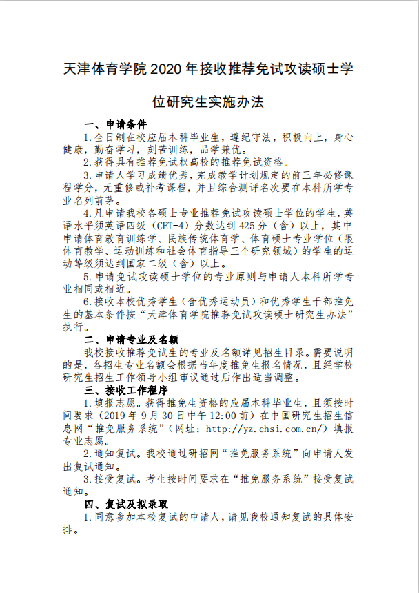 天津體育學(xué)院2020年接收推薦免試攻讀碩士學(xué)位研究生實(shí)施辦法